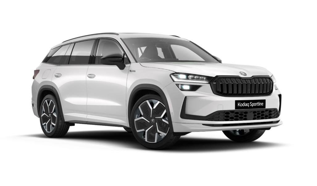 MY25 Skoda Kodiaq Sportline finished in Moon White Metallic paint with Black Suede and Leatherette interior.