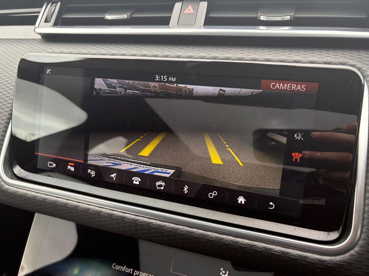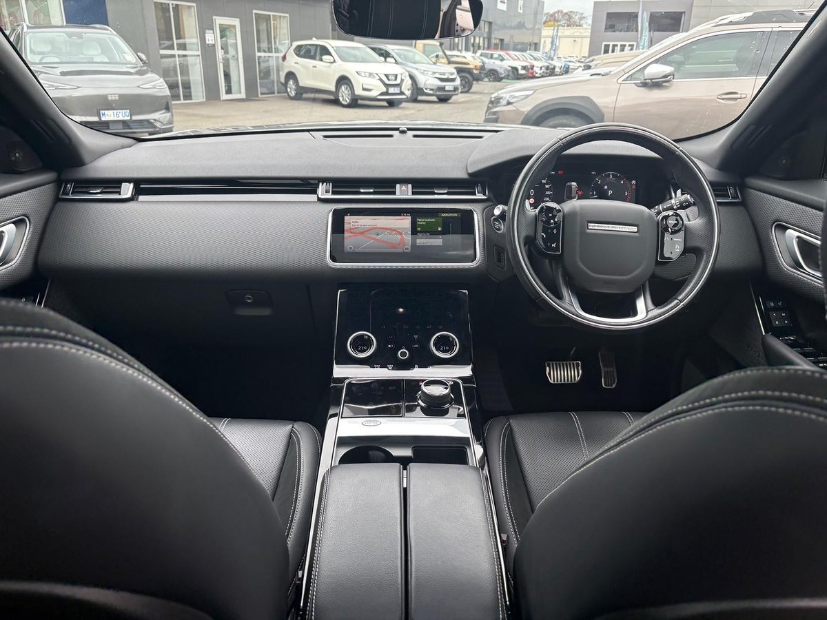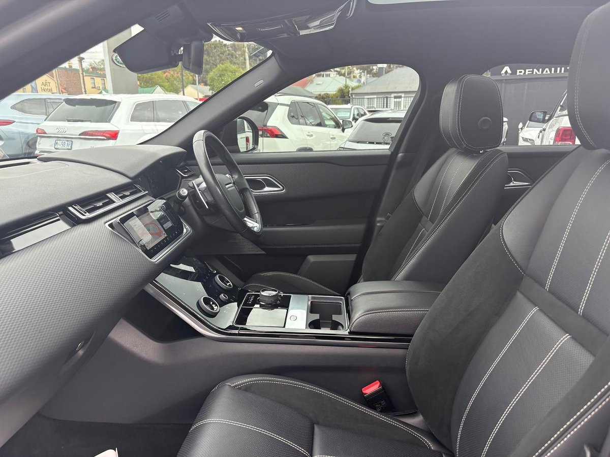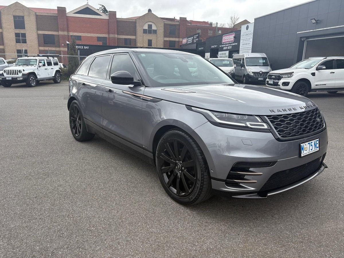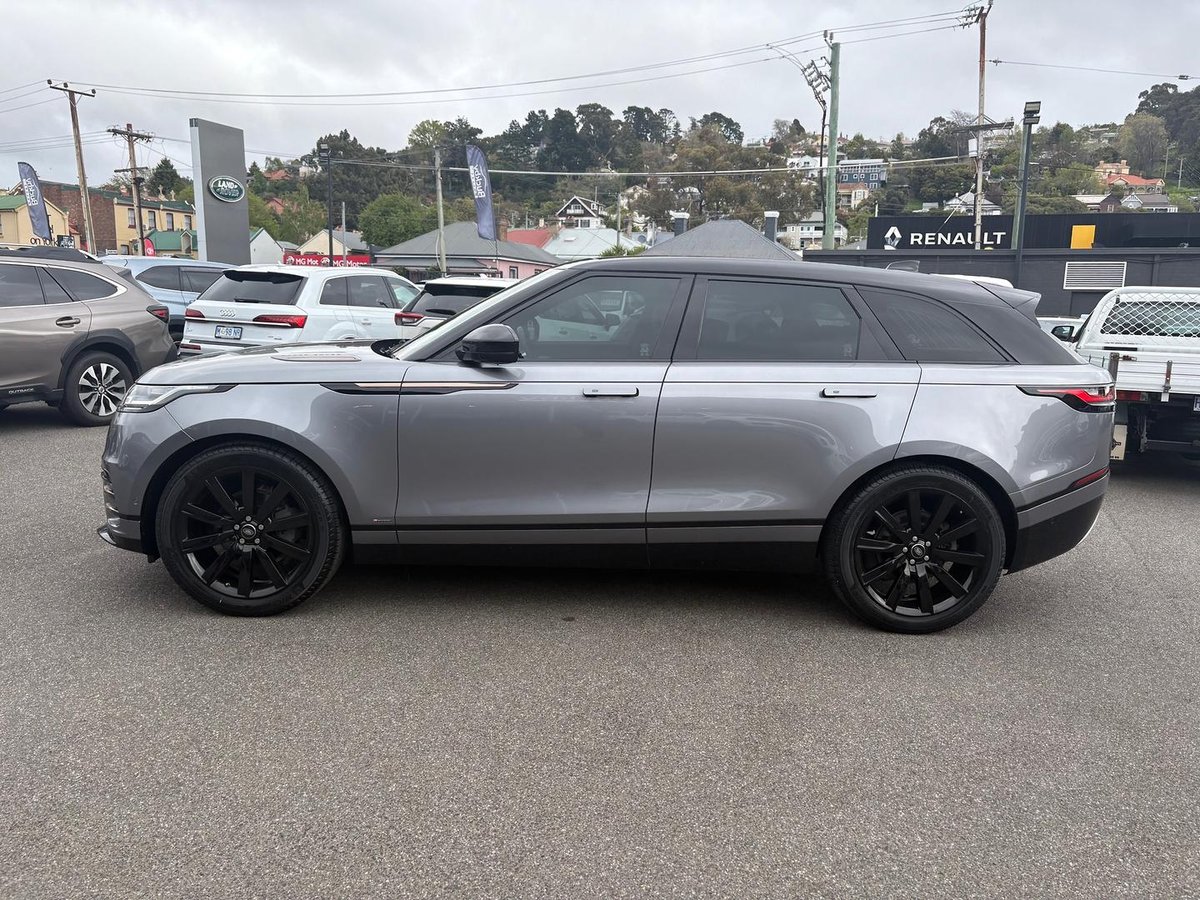 Appealing Range Rover Velar D240 R Dynamic SE in Eiger grey metallic with black leather/suede cloth seats, features fixed panorama sunroof with powered blind, 21 inch gloss black alloys, Santorini black roof, privacy glass, Meridian Surround sound stereo, electronic air suspension, Apple Car Play, Blind spot assist, lane keep assist, Park assist, adaptive cruise control, bluetooth, navigation, keyless entry and start, great performance with economy from 2.0 turbo charged diesel with 177 kilowatts of power, 8 speed auto, very stylish and luxurious.